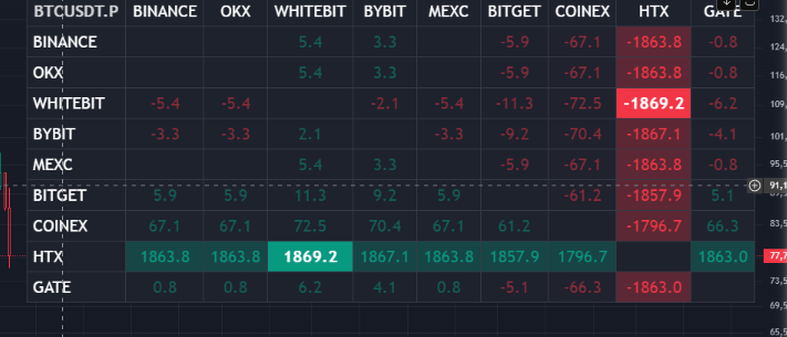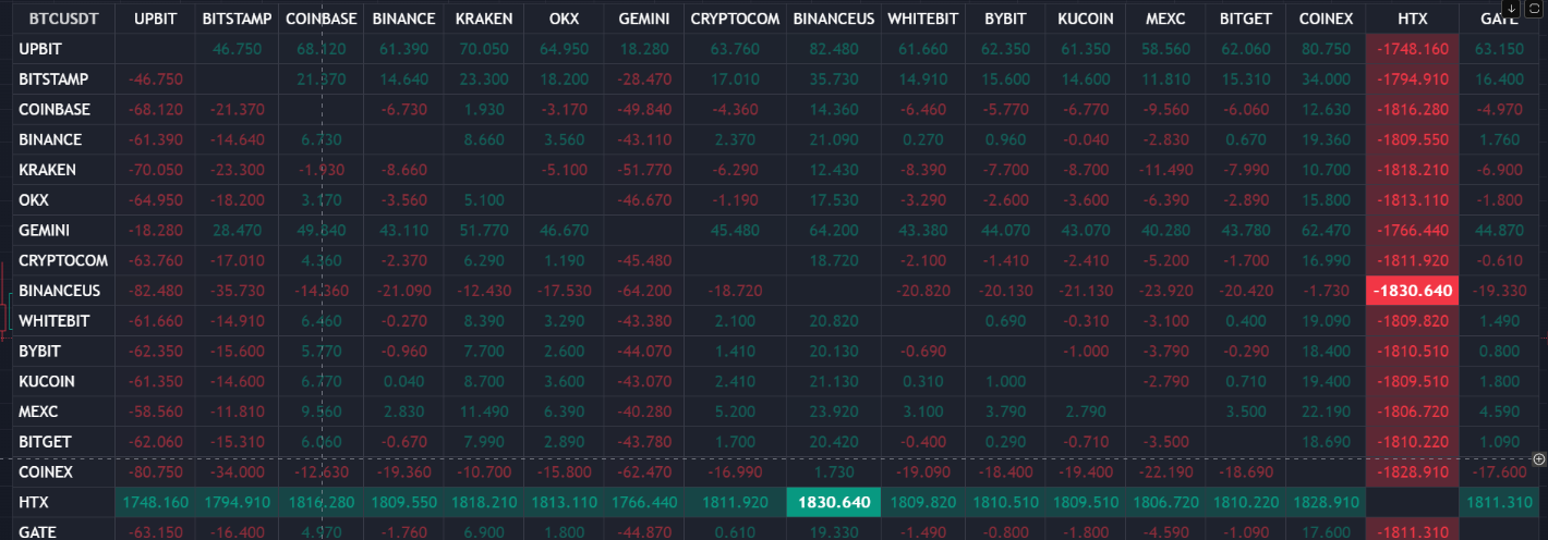 지표 창을 켜면 대시보드가 나타나는데, 행과 열에 거래소 이름이 있고, 각 칸에 가격 차이가 숫자로 표시돼요. 거래소 A에서(세로열) 사고 거래소 B에서 팔면(가로열) 얼마의 수익(또는 손실)이 나는지를 한눈에 볼 수 있다는 뜻입니다.